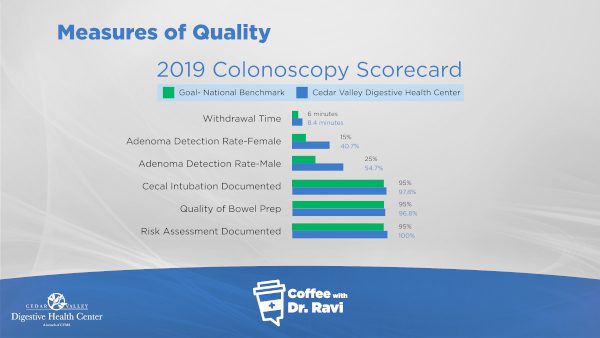 Finally, we present the Cedar Valley Digestive Health Center’s colonoscopy scorecard and compare our numbers to national benchmarks.