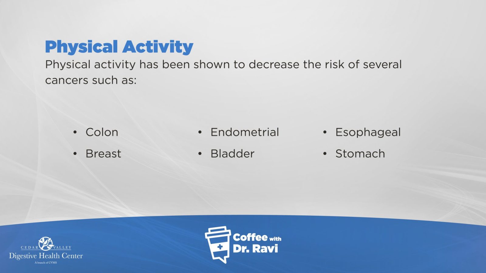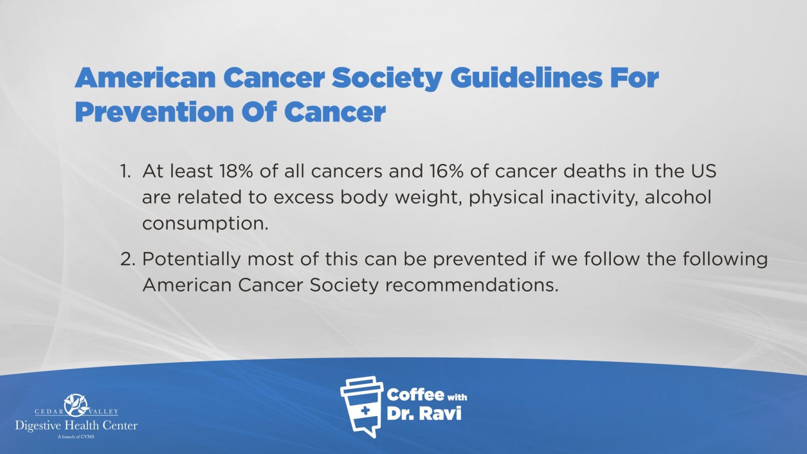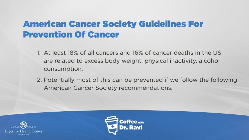 Thanks for joining us again. In today’s video we are talking about diet and exercise and how they play an important role in preventing various types of cancer.