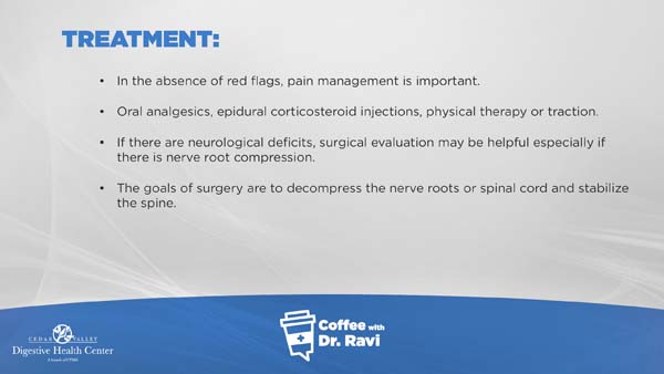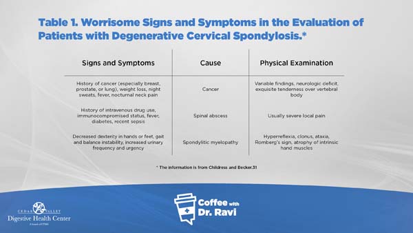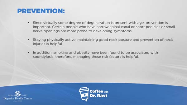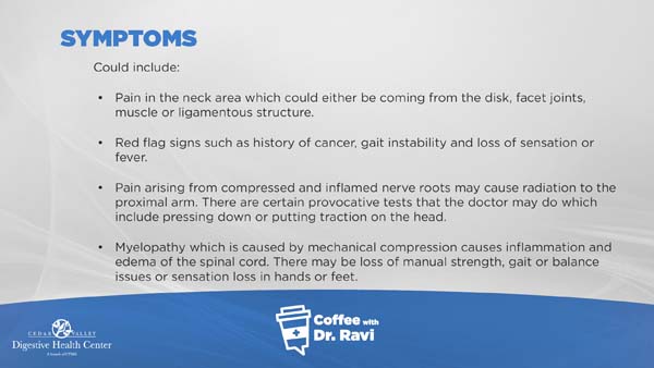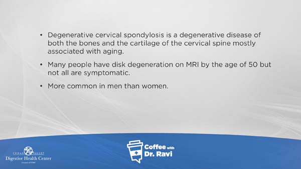 In this week’s video we are discussing degenerative cervical spondylosis, which often presents as neck pain. More serious symptoms include gait instability, loss of sensation, and fever. Many cases can be treated with oral analgesics, epidural corticosteroid injections, physical therapy or traction, although some more serious cases may require surgery.