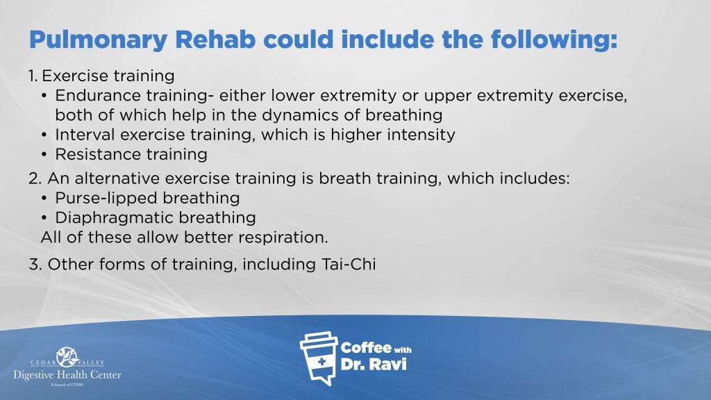 On this week’s Coffee with Dr. Ravi, we’re talking about pulmonary rehab. We’ll discuss what pulmonary rehab is, tips for managing lung disease, and examples of diaphragmatic breathing, a training exercise you can do to improve your breathing.