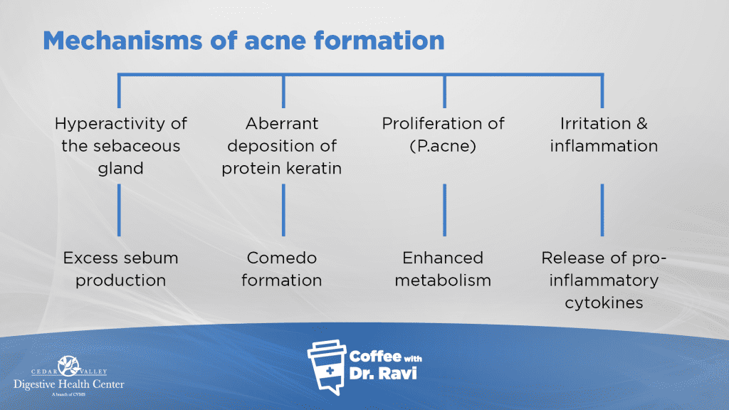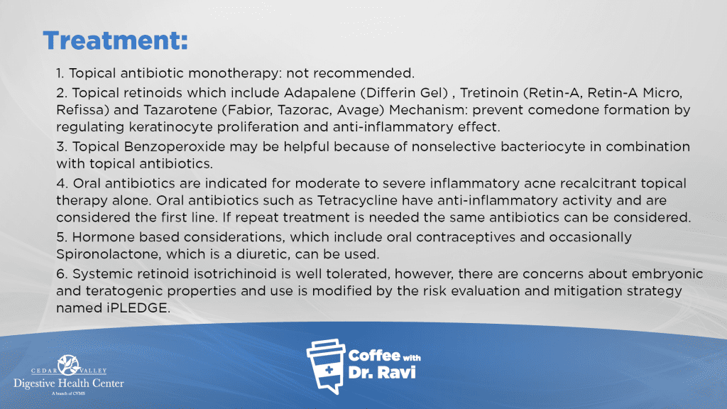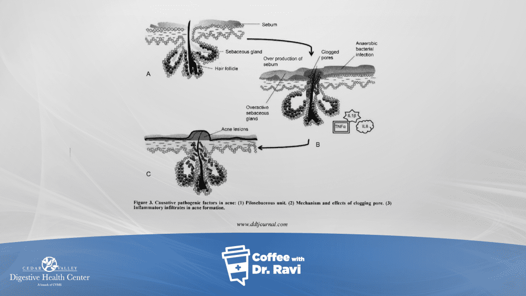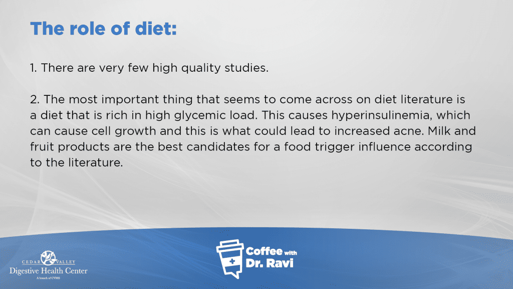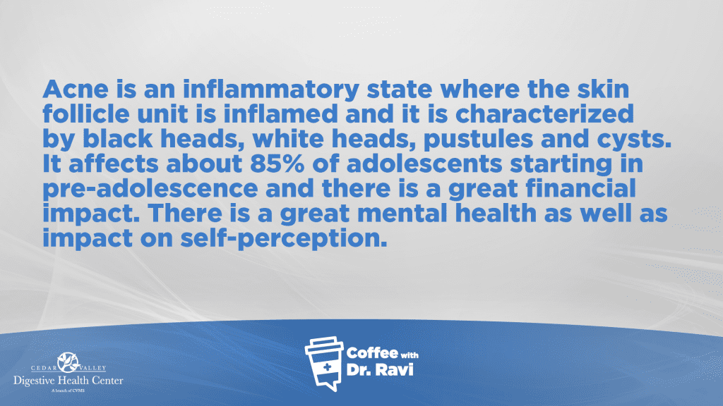 This week, we’re discussing what acne is and how to treat it. Acne is an inflammatory state where the skin follicle unit is inflamed and it is characterized by black heads, white heads, pustules and cysts. It affects about 85% of adolescents starting in pre-adolescence. We’ll go over the causes of acne, the treatments, and the effect that diet has on acne.